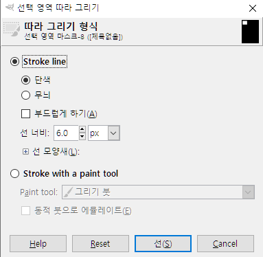 레이어창에서 만들어진 레이어를 선택하고 편집 -> 선택 영역 따라그리기를 선택한다.